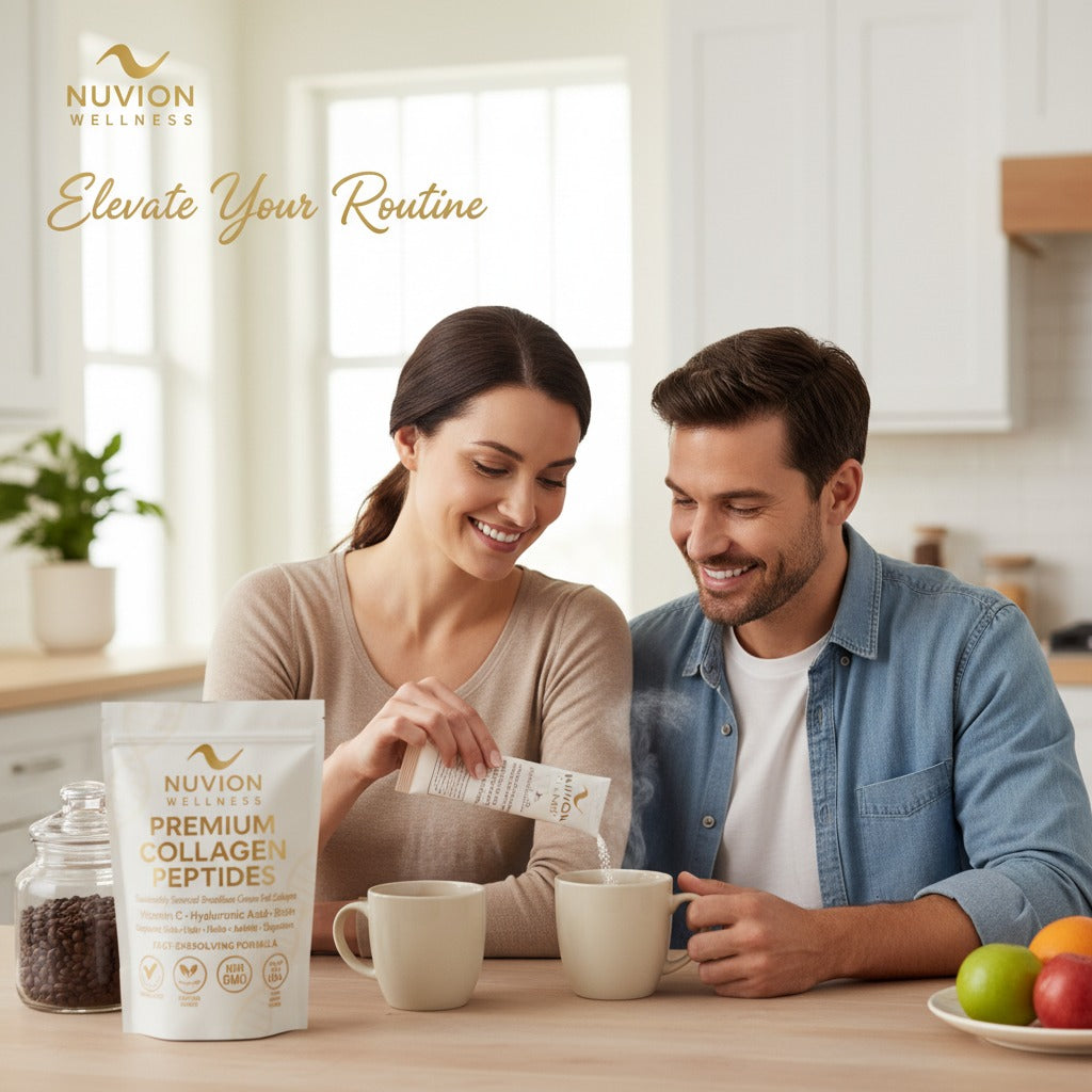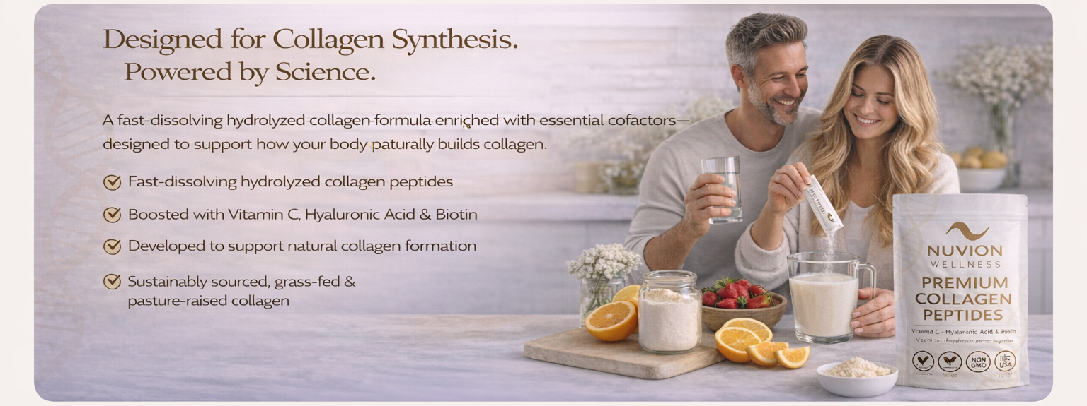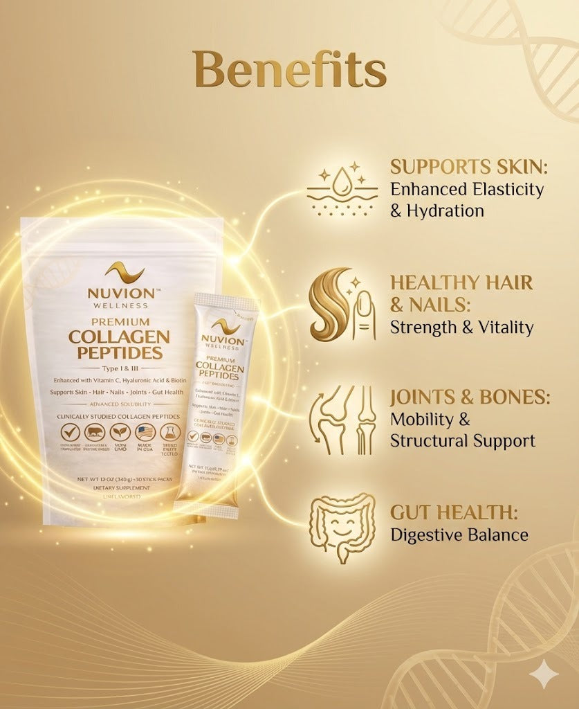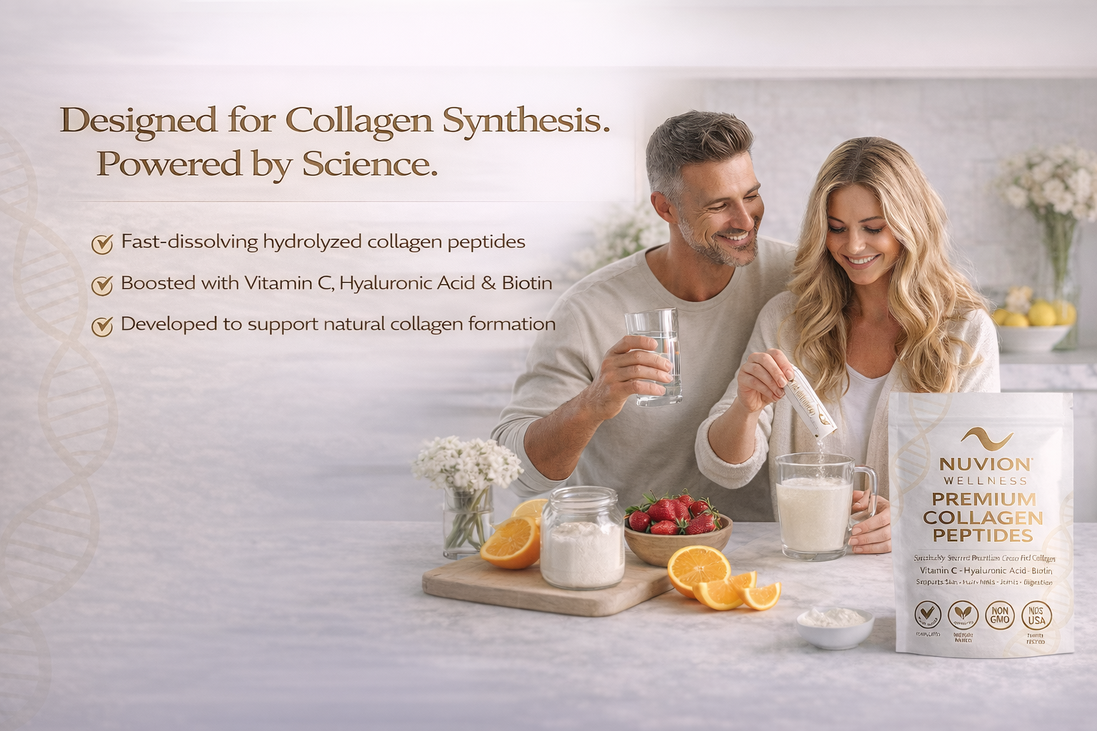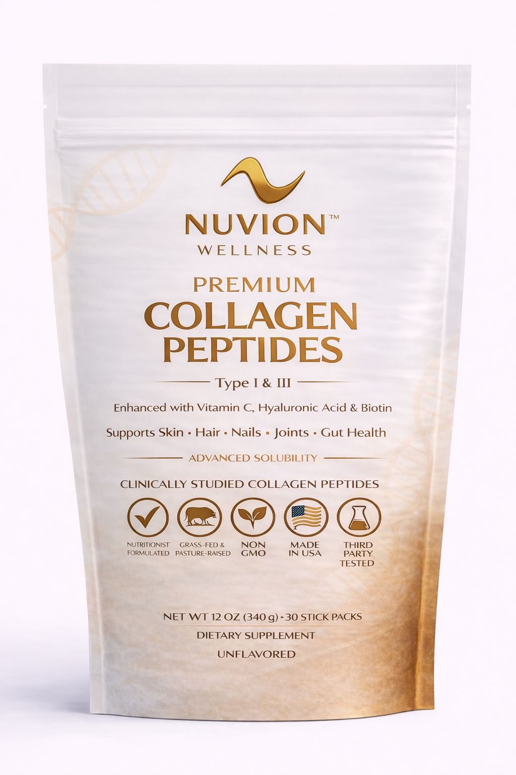 Born from the belief that beauty starts within, Nuvion Collagen is crafted by expert nutritionists and biochemists using clinically studied hydrolyzed collagen peptides sourced from grass-fed, pasture-raised bovines in nutrient-rich South American regions. It’s formulated with Vitamin C to support natural collagen synthesis, plus Hyaluronic Acid for hydration and joint comfort and Biotin to support healthy hair, skin, and nails. Convenient single-serve stick packs dissolve quickly with a neutral taste, making daily use simple anywhere. Designed for high bioavailability and easy absorption.*